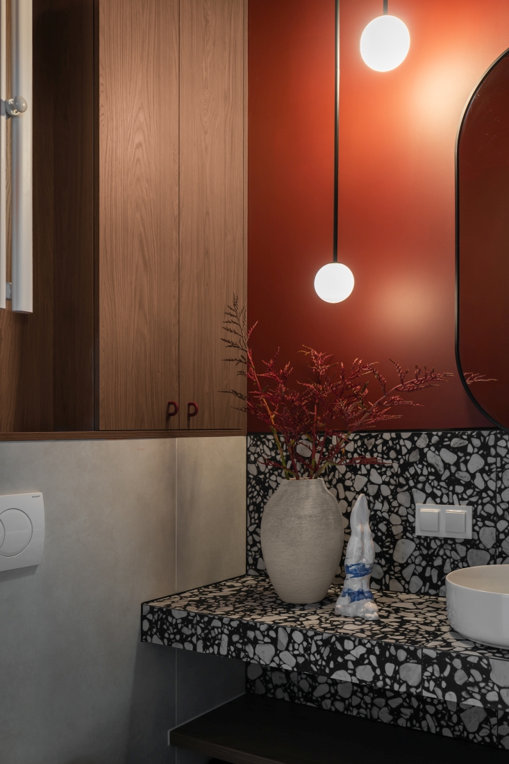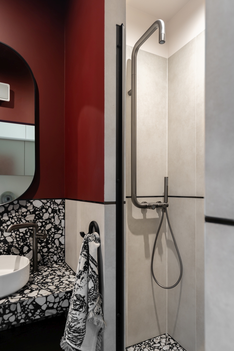 Łazienka została zaprojektowana jak starannie wyreżyserowana opowieść, podzielona na dwie wyraźne strefy. Część umywalkowa przyciąga uwagę wzorzystymi, kontrastowymi płytkami oraz bordowymi ścianami i sufitem, tworząc niemal teatralne tło dla codziennych rytuałów. W kontraście do niej strefa prysznicowa została wyciszona – to jasna, stonowana wnęka wydzielona ścianką działową i szklanymi drzwiami, sprzyjająca relaksowi.