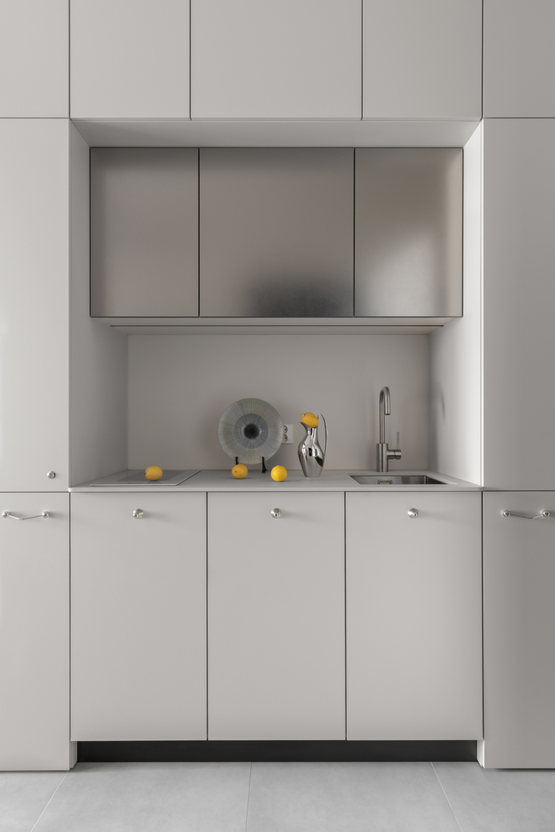 Cały apartament zaprojektowano z myślą o intensywnym użytkowaniu. Trwałe materiały, proste fronty pozbawione zdobień, płytki zamiast tradycyjnych podłóg oraz lekkie, mobilne meble to decyzje, które łączą estetykę z praktycznością. Efektem jest wnętrze odporne na upływ czasu i jednocześnie przyjazne dla użytkownika.