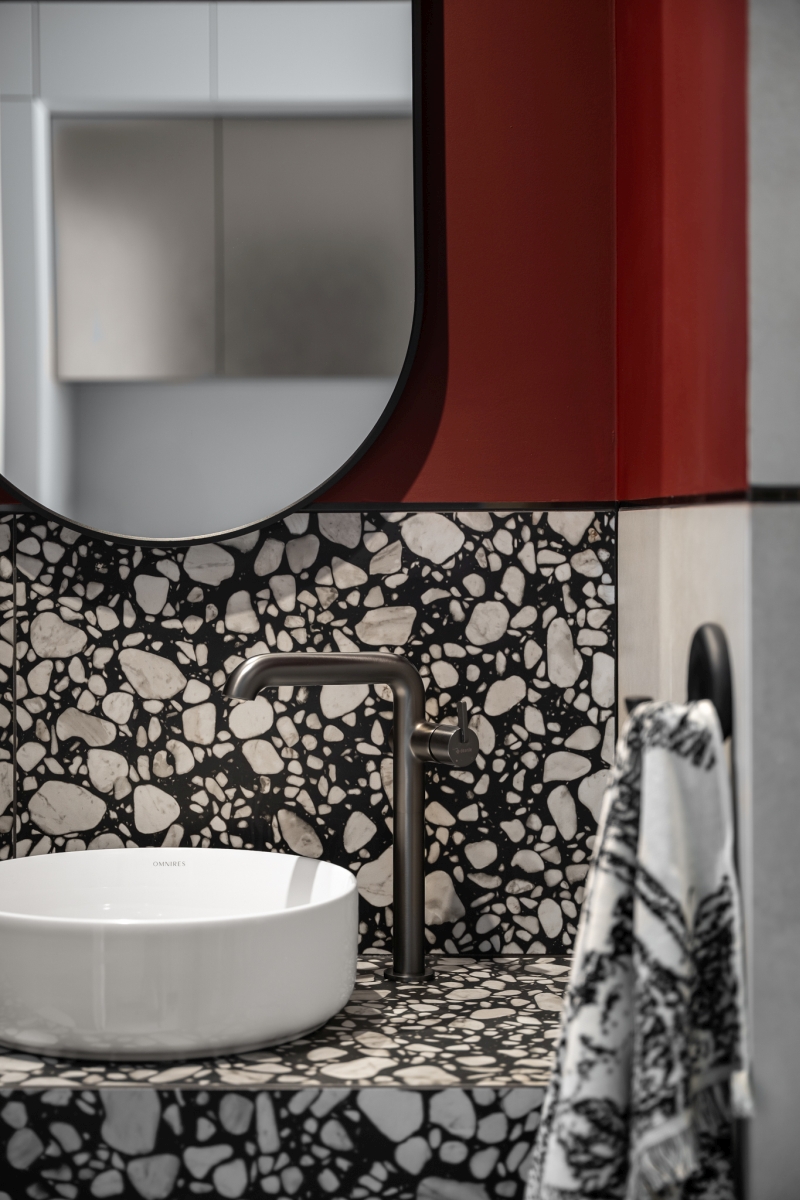Istotnym elementem tej przestrzeni jest armatura z serii Silia marki Deante Design Studio. Deszczownica i bateria umywalkowa tworzą spójną, konsekwentną całość, wpisując się w założenie eleganckiego minimalizmu. Opływowe formy oparte na motywie wygiętej rury oraz ręcznie dopracowane detale nadają armaturze miękkości, a wykończenie titanium subtelnie koresponduje z bordową kolorystyką wnętrza. Forma deszczownicy przyciąga uwagę i staje się jednym z rozpoznawalnych elementów łazienki, wprowadzając do wnętrza miękkość i nowoczesny sznyt.