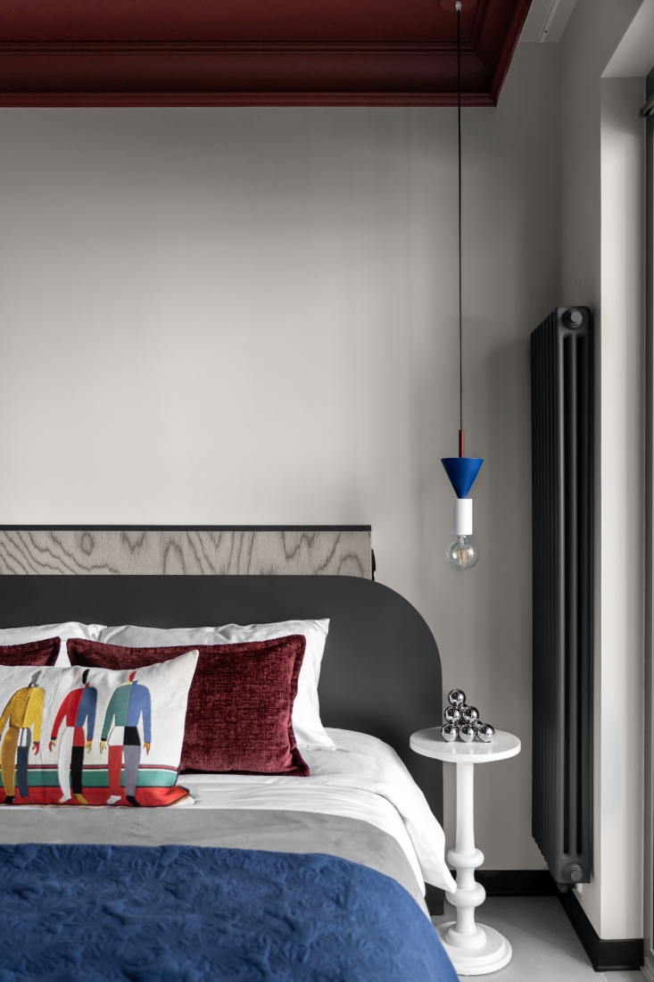 Wisząca szafa z lustrzanymi frontami niemal znika w przestrzeni, optycznie ją powiększając, a niska przedścianka za wezgłowiem łóżka, zaprojektowanego na wymiar, pełni jednocześnie funkcję półki, miejsca na osprzęt oraz nośnika subtelnego oświetlenia LED.