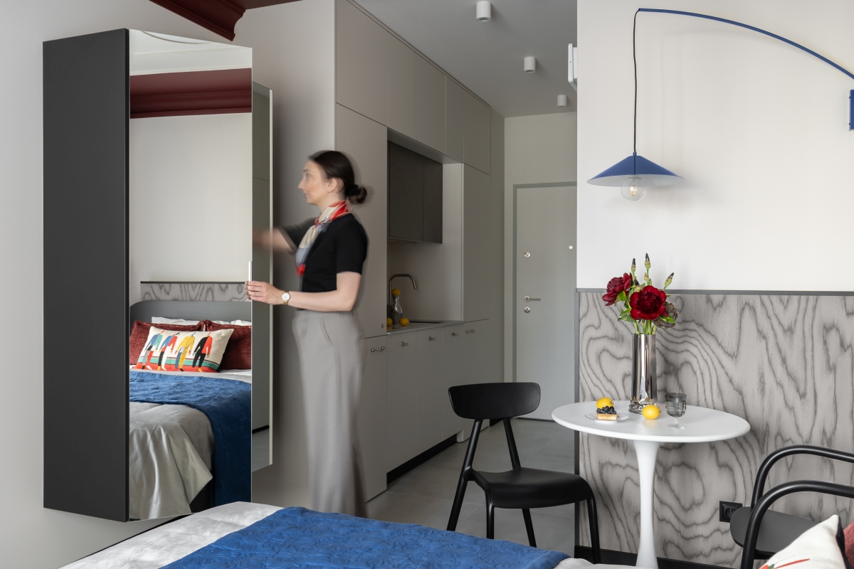 Projekt tego mikroapartamentu to dowód na to, że mały metraż nie musi oznaczać zachowawczości. Wręcz przeciwnie – ograniczona powierzchnia wymaga odwagi, konsekwencji i zaufania do projektowej wizji. Dzięki śmiałym decyzjom kolorystycznym, świadomemu operowaniu skalą oraz precyzyjnie dobranym materiałom powstała przestrzeń funkcjonalna i dopracowana w każdym detalu. To wnętrze, które nie próbuje być większe, niż jest, lecz w pełni wykorzystuje swój potencjał.