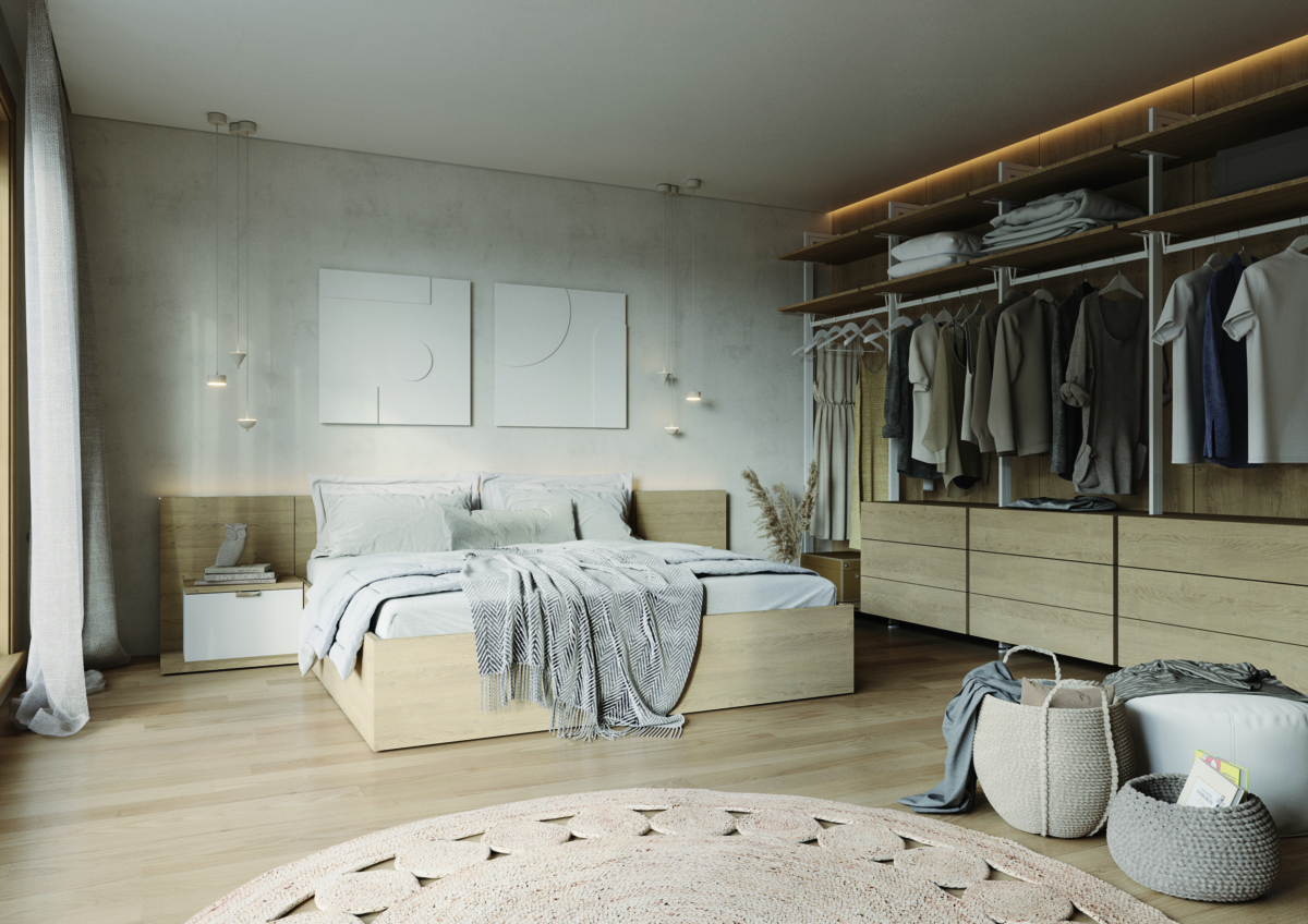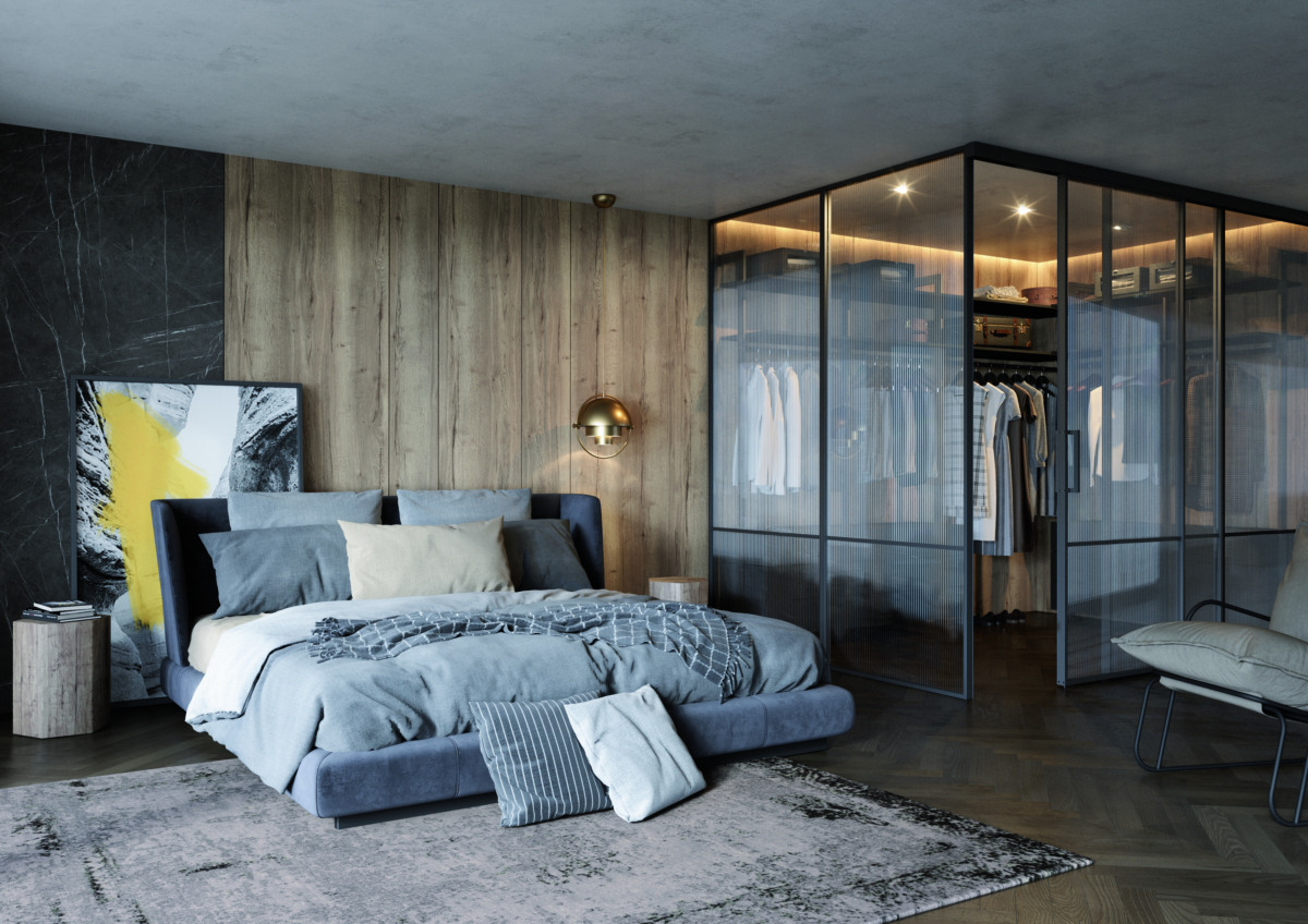 Dzięki temu garderoba staje się integralną częścią sypialni, a jednocześnie nie zaburza jej estetyki.