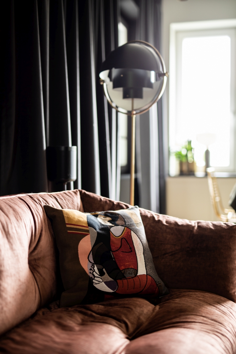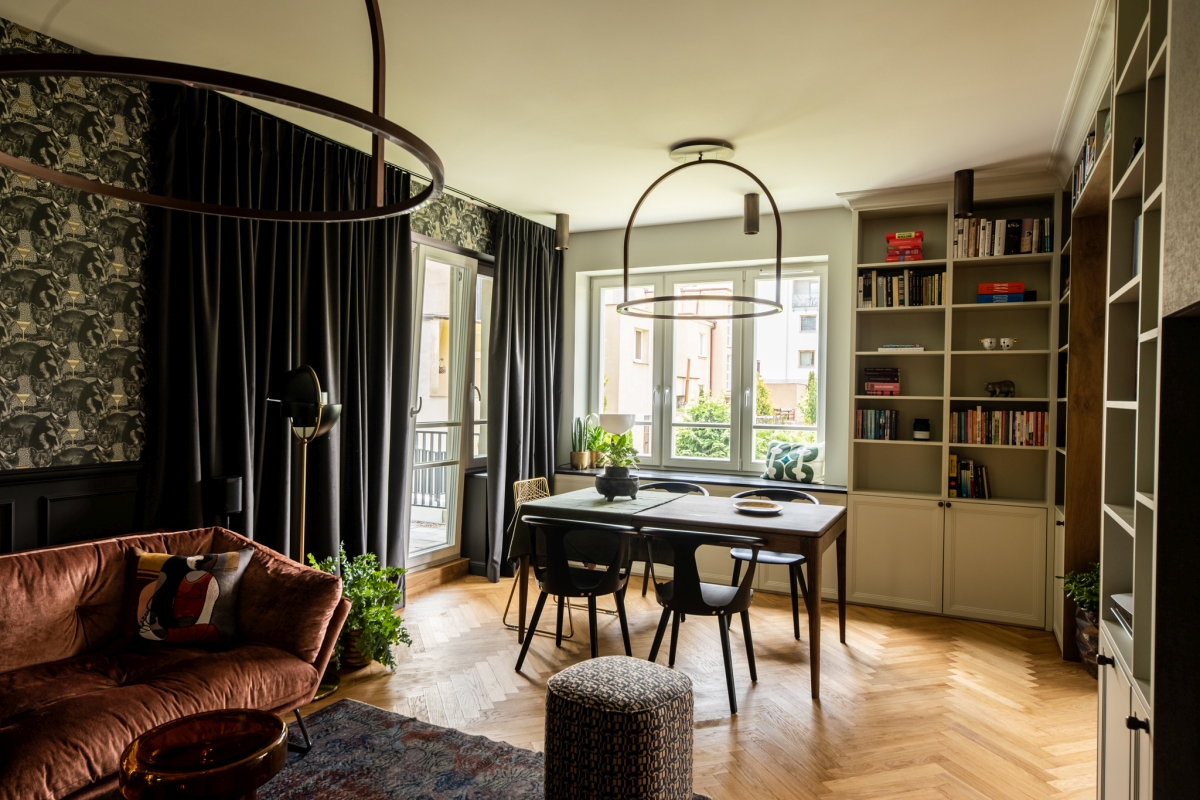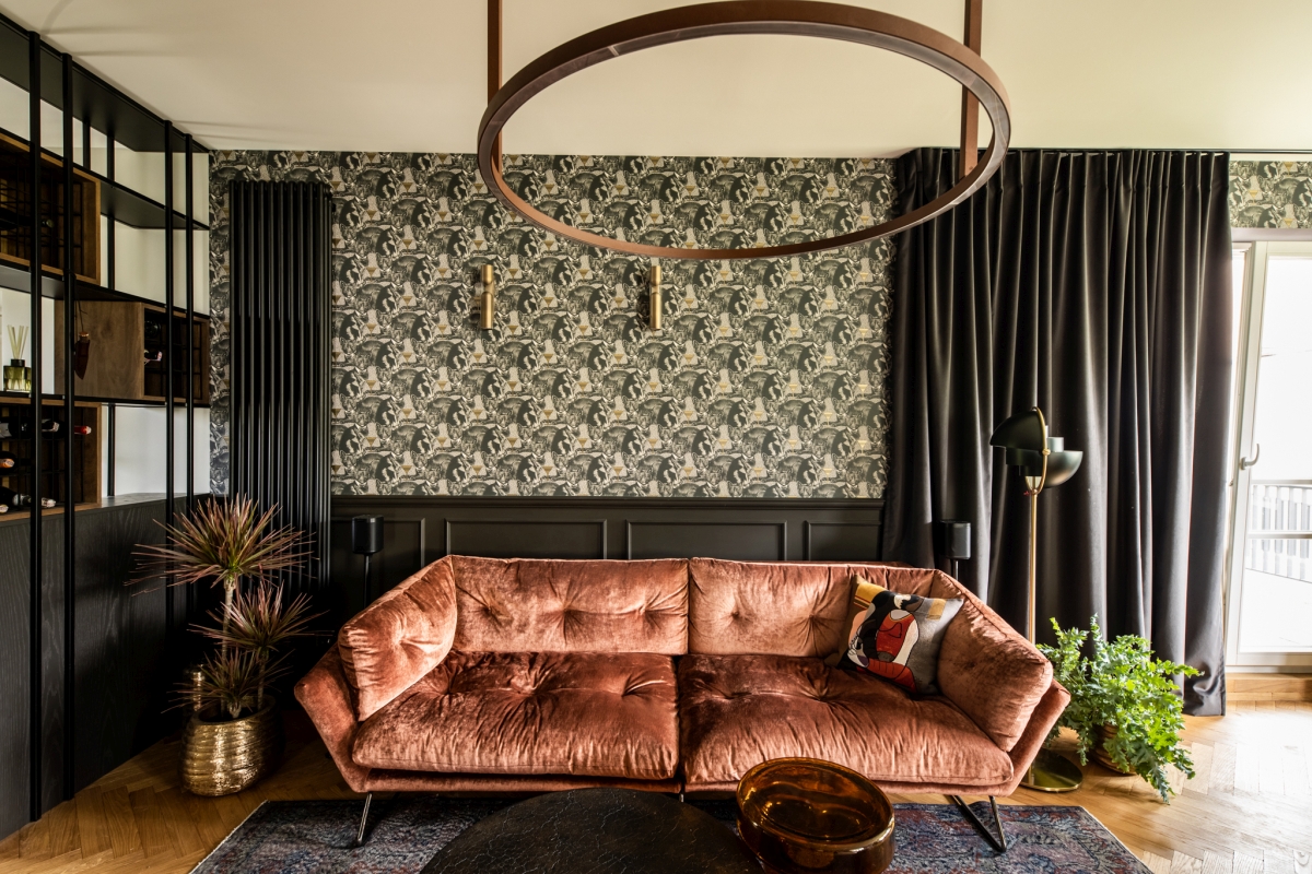Strefa wypoczynkowa jest świadomą kompozycją kontrastów. Miękka, welurowa sofa Saba Italia w odcieniu ciepłego brązu zestawiona została z wyrazistą tapetą o bogatym wzorze oraz czarną stolarką i metalowymi akcentami. Architektki bawią się tu materiałami: ciepłe drewno sąsiaduje z chłodniejszym metalem, a organiczne kształty roślin kontrastują z geometrycznymi liniami zabudowy. Taka różnorodność nie wprowadza chaosu – przeciwnie, nadaje wnętrzu charakteru i głębi.