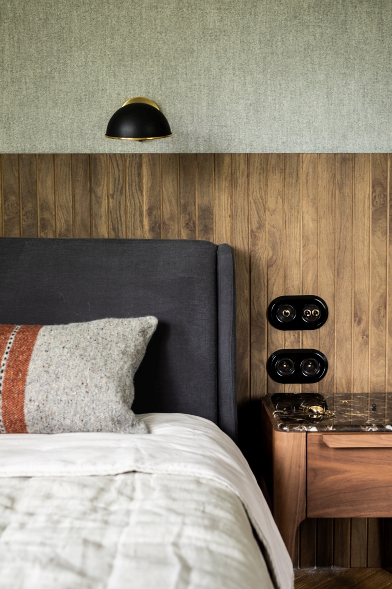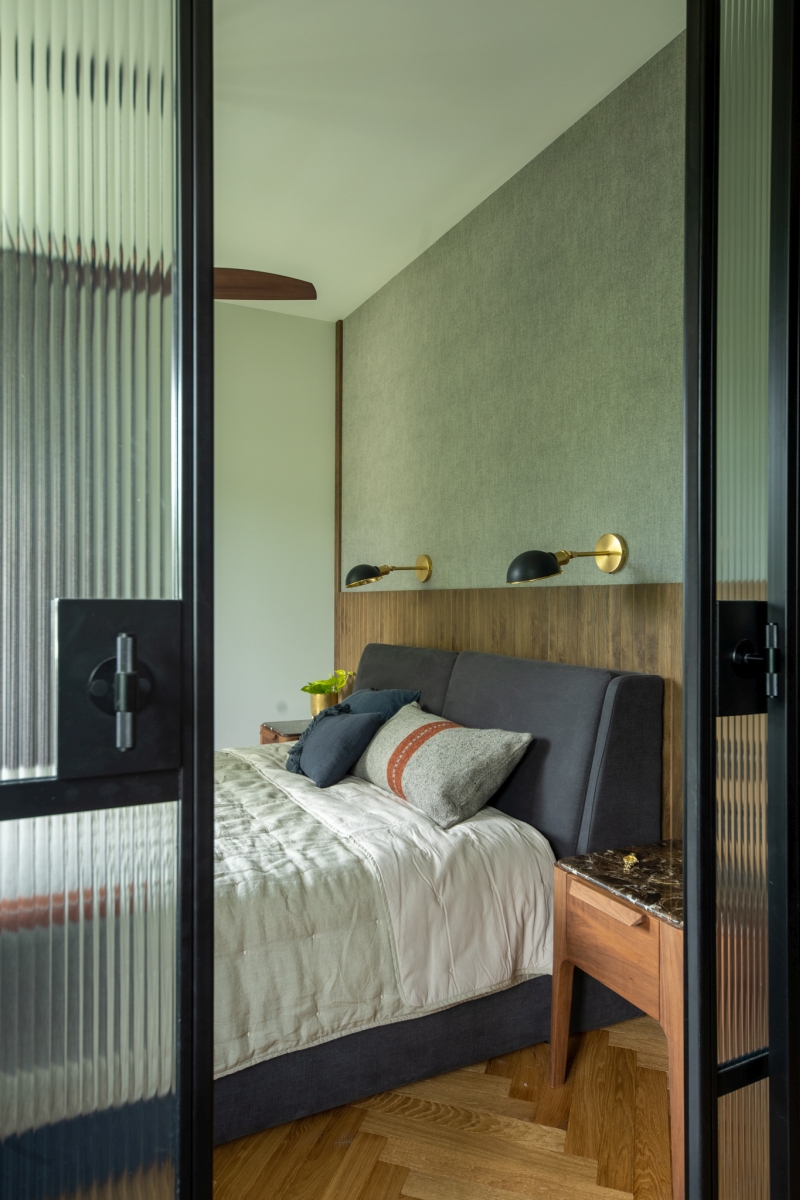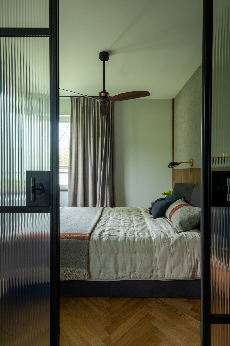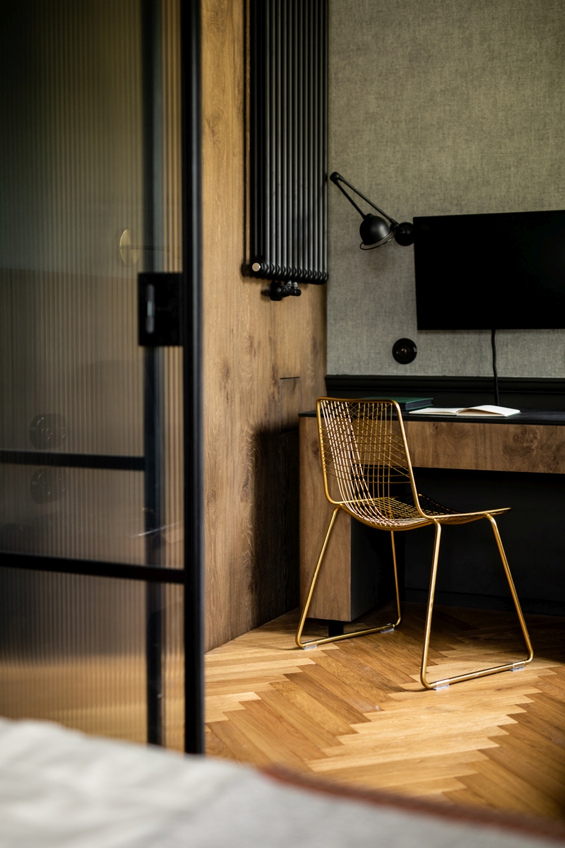 Część prywatna została zaprojektowana jako spokojne, wyciszone pomieszczenie. Ściany sypialni wykończono tkaninową tapetą o subtelnej fakturze, która ociepla przestrzeń i dodaje jej elegancji. Dolną część ścian zdobi fornirowana lamperia – detal, który wprowadza naturalność i spójność z pozostałymi pomieszczeniami. Tuż obok sypialni znajduje się niewielkie biuro, oddzielone stalowo-szklaną ścianką. Transparentna przegroda od Mag Haus pozwala zachować lekkość przestrzeni, a jednocześnie wyraźnie definiuje funkcję miejsca pracy.