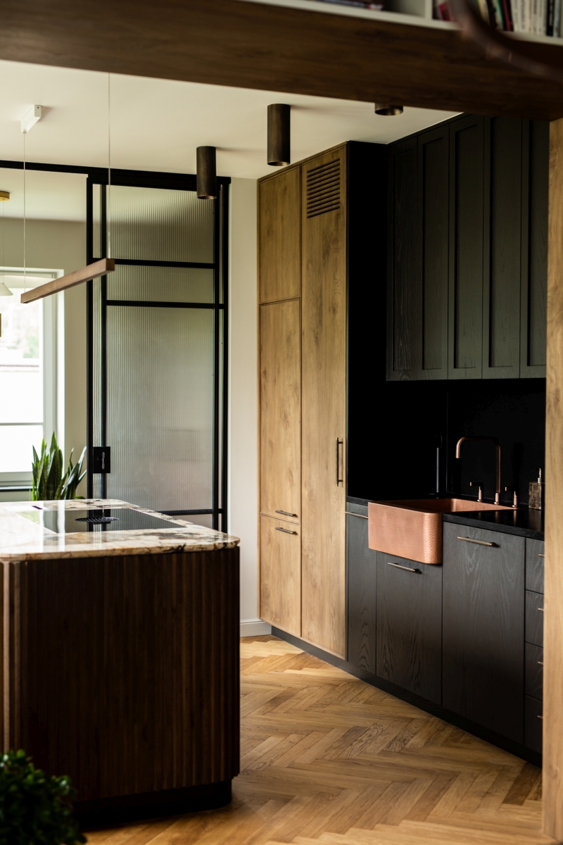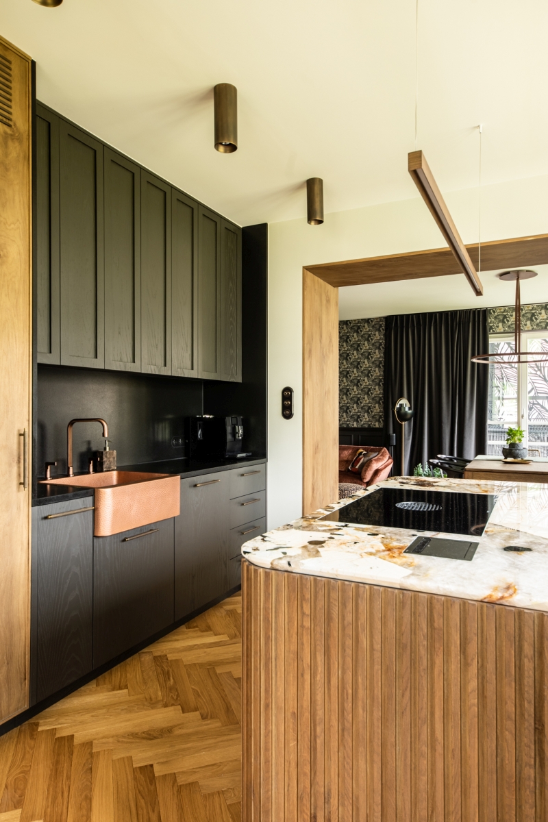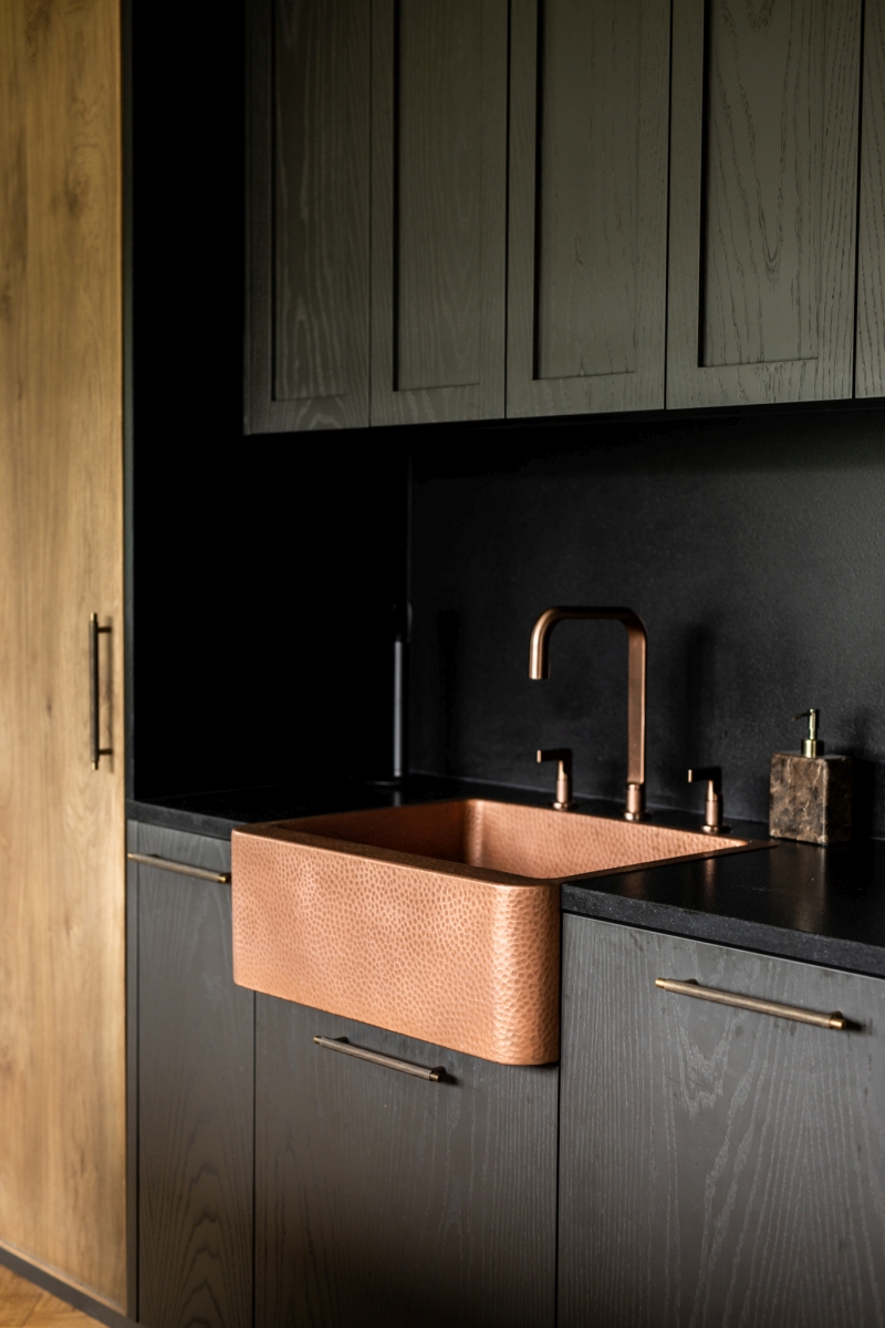 Ciekawym akcentem jest miedziany zlew oraz armatura o wyrafinowanej formie, które nadają przestrzeni szlachetnego charakteru. Ciemna zabudowa meblowa kontrastuje z ciepłem drewna i kamienia, tworząc wyważoną kompozycję.