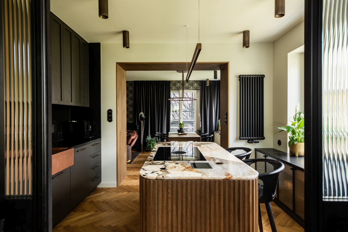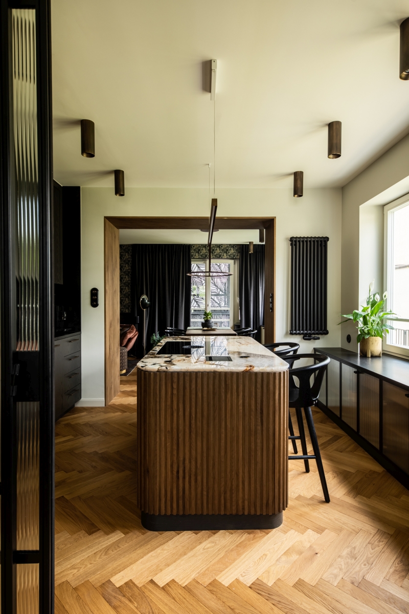Na 80 m² w jednej z gdyńskich dzielnic powstało wnętrze, którego charakter buduje świadoma praca z materiałem i detalem. Projekt pracowni masz.design opiera się na przemyślanej kompozycji faktur i surowców – od wyrazistej kuchennej wyspy z kamienia Patagonia, przez lekkie stalowo-szklane podziały przestrzeni, po drewniane powierzchnie o starannie dopracowanym wykończeniu. Całość zaprojektowano z myślą o codziennym życiu i spotkaniach, dlatego przestrzeń pozostaje otwarta, płynna i naturalnie sprzyja wspólnemu spędzaniu czasu.