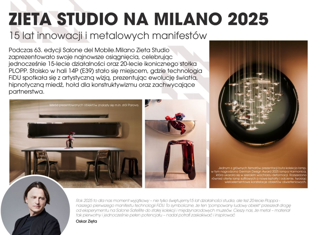 – Rok 2025 to dla nas moment wyjątkowy – nie tylko świętujemy 15 lat działalności studia, ale też 20-lecie Ploppa, naszego pierwszego manifestu technologii FiDU. To symboliczne, że ten ‘pompowany ludowy obiekt’ przeszedł drogę od eksperymentu na Salone Satellite do stałej kolekcji i międzynarodowych muzeów. Cieszy nas, że metal – materiał tak pierwotny i jednocześnie pełen potencjału – nadal potrafi zaskakiwać i inspirować – opowiada Oskar Zięta.