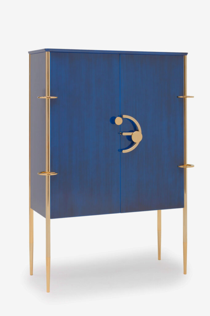 Drugim wartym uwagi jest model CLOCKWORK – komoda, która celebruje mechanikę – zwykle ukrywaną, a tutaj wystawioną na piedestał. Kredens z orzecha canaletto, z elementami konstrukcyjnymi i ozdobnym uchwytem, który może być wykonany z mosiądzu ze złotym wykończeniem, z polerowanego niklu lub brązu, które stają się ozdobami niczym precjoza, a wnętrze wykończone skórą z LED-owym podświetleniem potwierdza, że to mebel stworzony dla miłośników wyrafinowanych detali. Uchwyt CLOCKWORK inspirowany jest mechanizmem zegara i sprawia, że otwieranie i zamykanie jest niemal zabawne. Nawet zawiasy prezentowane są jako zewnętrzne przekłucia, które swoim kształtem towarzyszą obrotowi drzwi. W tym projekcie, który celebruje mechanikę, aspekty estetyczne i funkcjonalne harmonijnie się łączą.