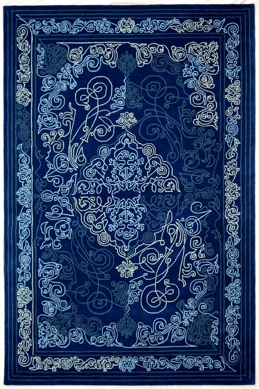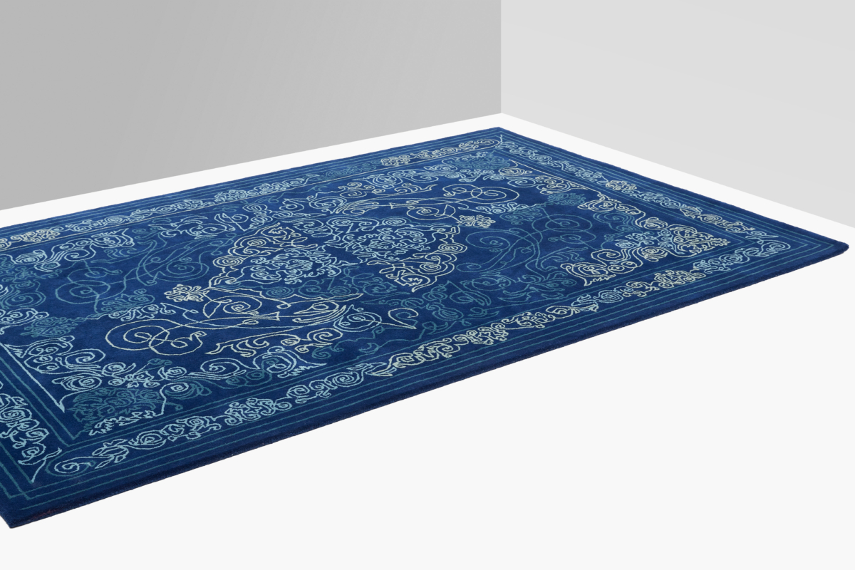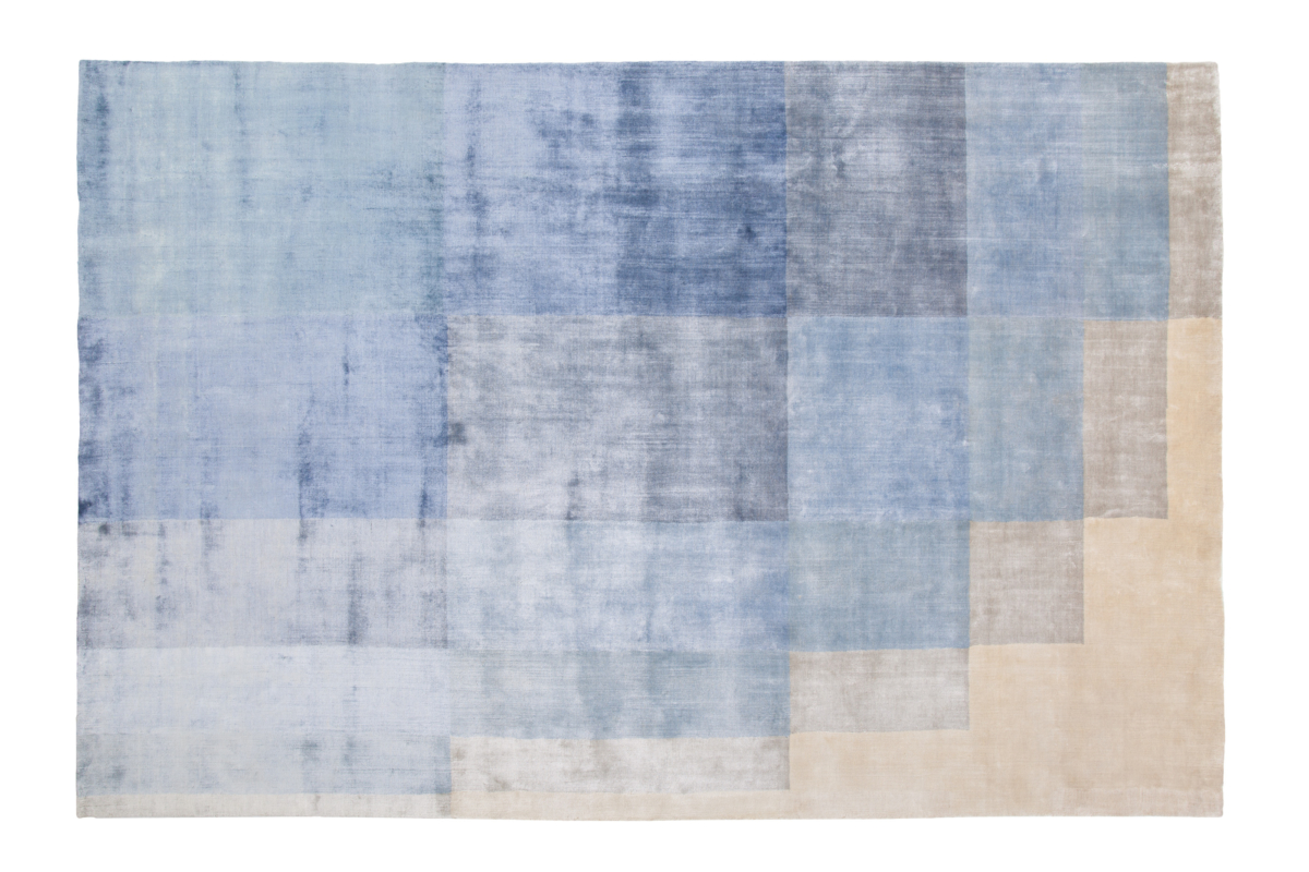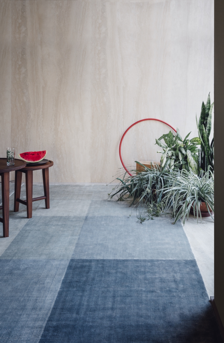 Bardziej ekspresyjny charakter ma dywan One-Stroke Blue studia nendo – ręcznie tufowany, z dziesięciomilimetrowym runem, dekorowany wzorem przypominającym pojedynczy gest pędzla. Minimalizm? Owszem. Ale podany w formie, która sama opowiada historię.