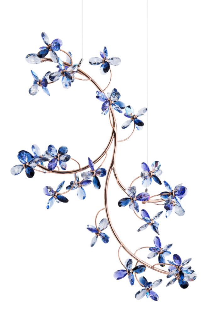 Najbardziej poetycką kolekcją pozostaje EDEN – świetlne gałęzie z mosiądzu, ozdobione krystalicznymi kwiami w aż 38 kolorach z wzornika. To projekt balansujący na granicy między sztuką a naturą, który zdaje się kwitnąć w powietrzu. To prawdziwa uczta dla oczu. Kunszt instalacji podkreśla to, że są ręcznie wykonywane na zamówienie. Eden w wersjach z niebieskimi kryształami daje światło o miękkiej, wręcz akwarelowej jakości. Idealny wybór do sypialni, salonów, miejsc do relaksu.