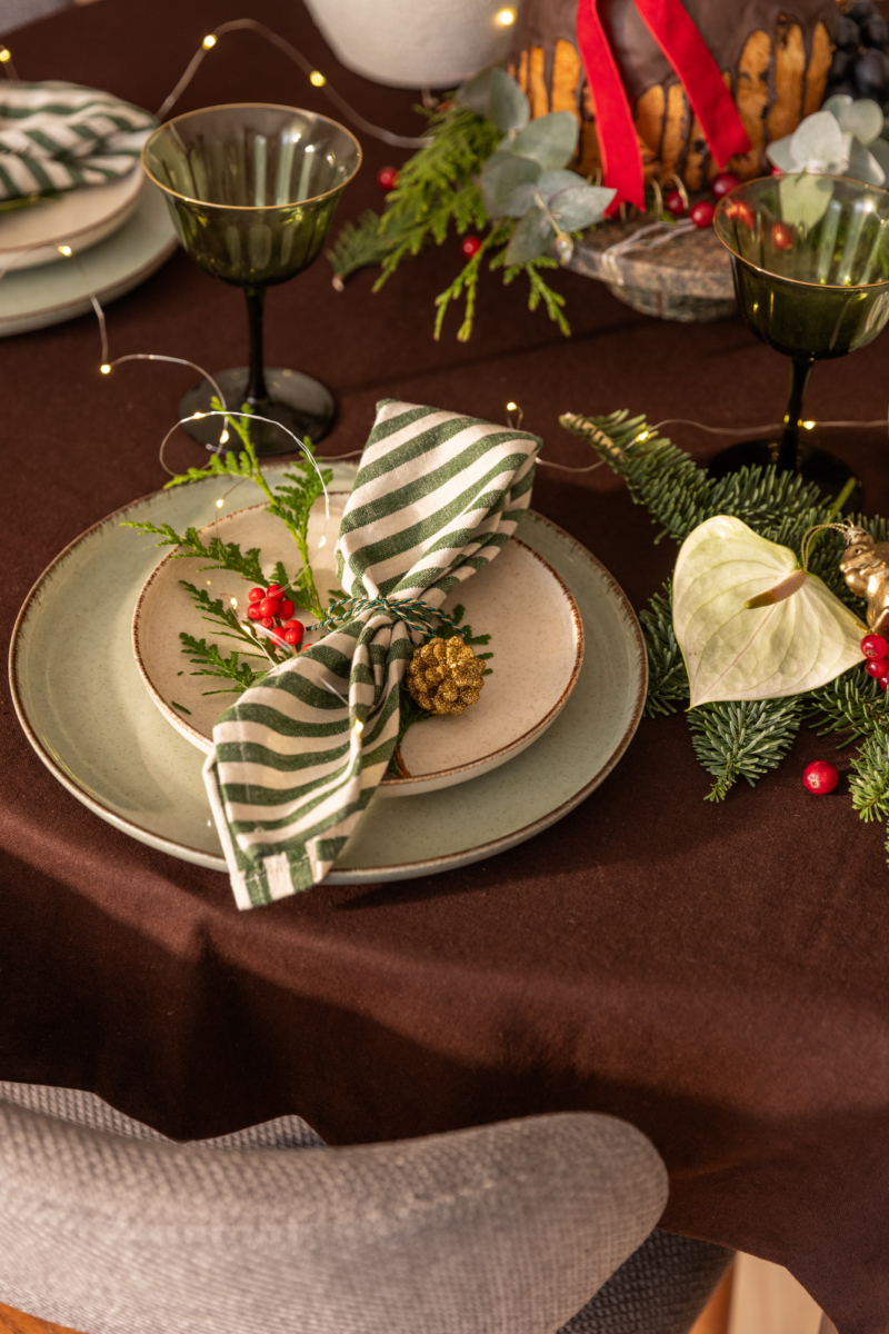 Serce mieszkania stanowi otwarta przestrzeń łącząca salon, jadalnię i kuchnię. Zabudowa kuchenna na wymiar wykonana w stolarni Decoroom została utrzymana w spokojnych odcieniach taupe i oliwki, które doskonale korespondują z rysunkiem kamienia zastosowanego w pasie roboczym i na blacie o naturalnym, żyłkowanym wzorze. Minimalistyczne fronty, ukryte uchwyty i podświetlenie LED tworzą spójną elegancką kompozycję. W centrum strefy dziennej znalazł się jadalniany stół nakryty ciemnym obrusem w modnym odcieniu gorzkiej czekolady, który tworzy elegancką bazę dla świątecznej stylizacji.