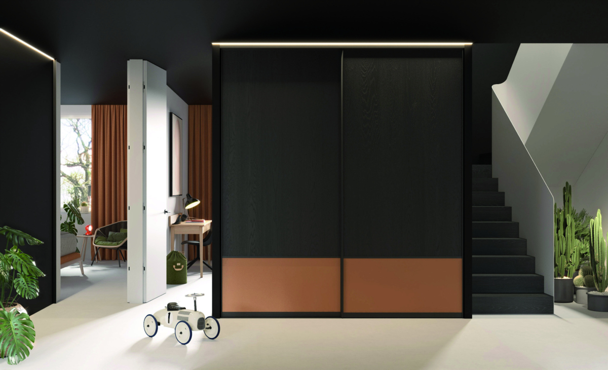 • Zintegrowane fronty – drzwi przesuwne lub uchylne mogą być wykonane w kolorze ściany, z lustrem lub dekoracyjnym wykończeniem, co pozwala optycznie powiększyć przestrzeń.