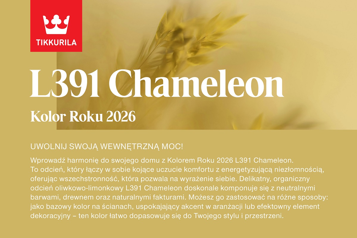 „Chameleon to wielowymiarowy odcień, który dostosowuje się do otoczenia. W świetle dziennym wywołuje poczucie spokoju, a w zacienionych lub słabo oświetlonych pomieszczeniach ujawnia wielowarstwową głębię, co czyni go wszechstronnym wyborem zarówno do wnętrz mieszkalnych, jak i przestrzeni komercyjnych. Barwa L391 Chameleon jest na tyle łagodna, by uspokajać, a jednocześnie na tyle żywa, by poprawić nastrój. W rezultacie wprowadza do przestrzeni kojący komfort i energetyzującą niezłomność, tworząc wnętrza budujące optymizm i wewnętrzną siłę” – komentuje Justyna Balińska, manager marki Tikkurila.