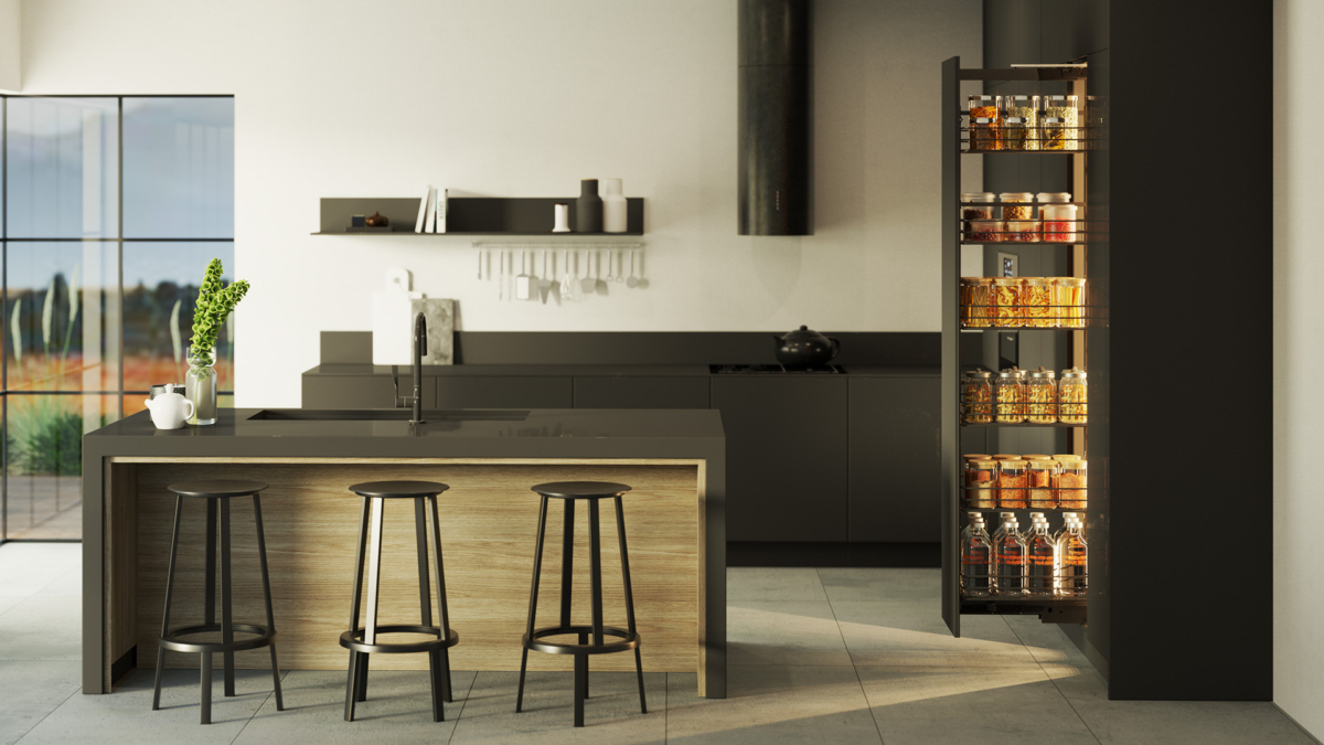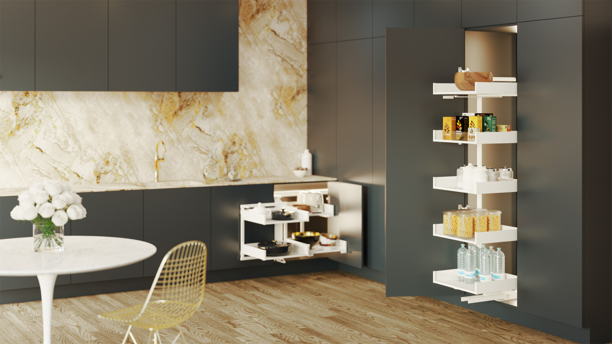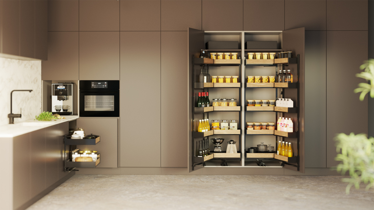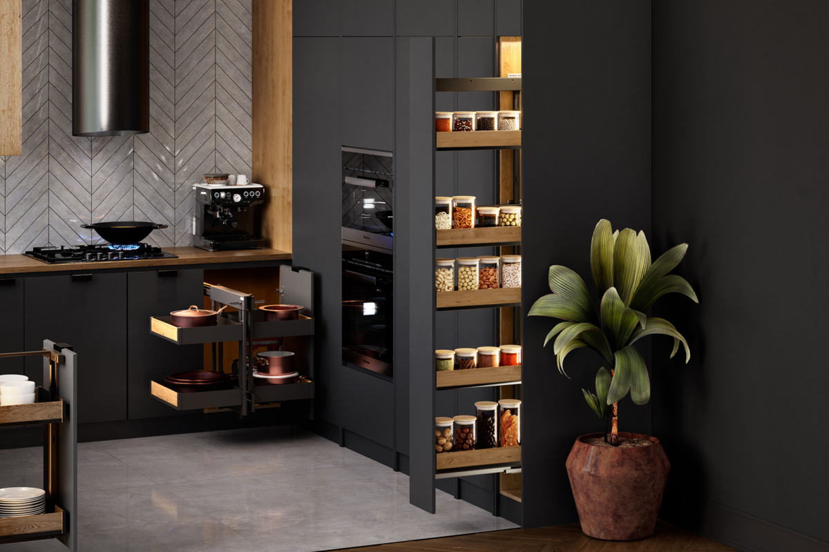 Cargo Maxi Space to funkcjonalne rozwiązanie, które po otwarciu frontu automatycznie wysuwa się na zewnątrz, zapewniając pełny wgląd w zawartość i wygodny dostęp do wszystkich przechowywanych produktów – bez konieczności sięgania w głąb szafki.