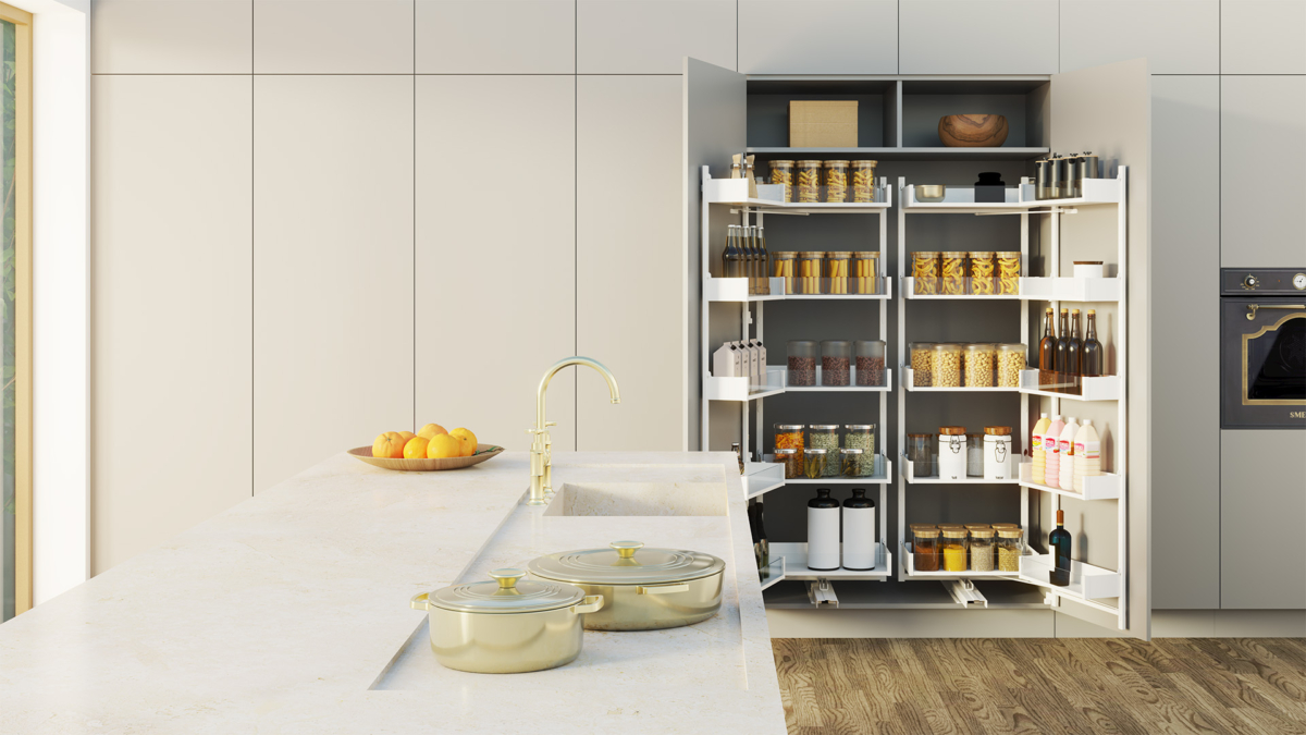Cargo Maxi Space to funkcjonalne rozwiązanie, które po otwarciu frontu automatycznie wysuwa się na zewnątrz, zapewniając pełny wgląd w zawartość i wygodny dostęp do wszystkich przechowywanych produktów – bez konieczności sięgania w głąb szafki.