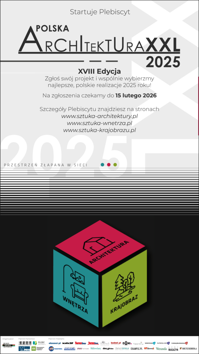 Redakcje serwisów sztuka-architektury.pl, sztuka-wnetrza.pl i sztuka-krajobrazu.pl od 19 stycznia do 15 lutego 2026 roku będą zbierały informacje o najciekawszych realizacjach publicznych i prywatnych w polskiej architekturze 2025 roku. Do Plebiscytu można także zgłaszać obiekty, które nie wzięły udziału w Plebiscycie Polska Architektura XXL 2024, a zostały oddane do użytku w 2024 roku.
