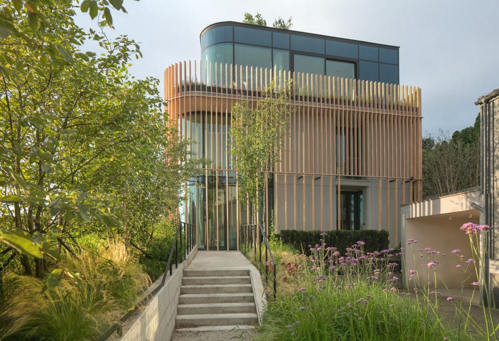 Kameralny budynek stanął przy trasie łączącej Stare Miasto z Wolą Justowską w Krakowie; jak podkreślają architekci, obiekt wpisuje się w trend architektury zeroemisyjnej, niezależnej od konwencjonalnych źródeł energii. Poza chęcią sięgnięcia po odnawialne źródła energii i materiały czy technologie o nikłym śladzie węglowym ważnym elementem projektu było wpisanie obiektu w kontekst Lasu Wolskiego i skarpy, u stóp której budynek stanął. Biurowiec otrzymał horyzontalną sylwetkę wpisaną w kształt terenu; zamknięto go w zwartej bryle o zaokrąglonych narożnikach, założonej na planie zbliżonym do kwadratu. Budynek wzniesiono z użyciem naturalnych materiałów, przede wszystkim drewna, ale i kamienia. Ważną częścią architektury uczyniono także roślinność, której sporo wprowadzono także do wnętrza budynku. Architekci analizując potrzeby użytkowników i charakter otoczenia, zaproponowali „podwójną” elewacje, która osłania od świata, ale zapewnia doskonałe doświetlenie wnętrz.